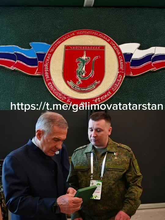 Это Герой России Раиль Габдрахманов в знак благодарности дарит Рустаму Минниханову знак 7-й отдельной гвардейской Чистяковской мотострелковой ордена славы I степени бригады