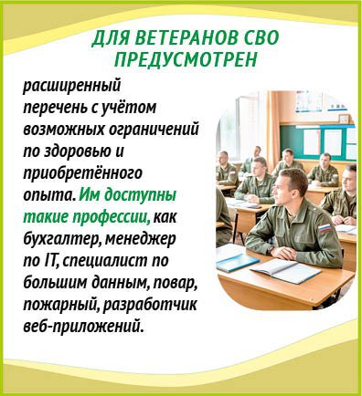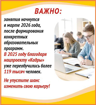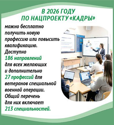 Определен перечень профессий для бесплатного переобучения по нацпроекту «Кадры» в 2026 году. Соискателям, желающим получить новые знания или повысить квалификацию, будет доступно 186 профессий, а для ветеранов специальной военной операции этот перечень дополняется еще 27 профессиями до 213 наиболее востребованных на рынке труда специальностей.