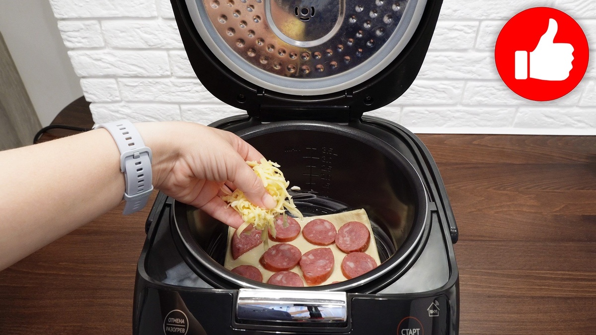 За 15-20 минут до начала процесса приготовления тесто следует вынуть из морозилки. Взбить яйцо и смазать одну часть теста с помощью кулинарной кисточки. Затем, предварительно смазав чашу мультиварки растительным маслом, аккуратно выложить тесто. На него разместить нарезанную колбасу и щедро посыпать тертым сыром. Завершить процесс заливкой оставшегося яйца сверху.