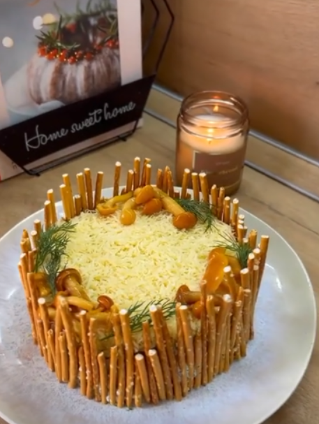 Как оказалось, процесс сборки прост, но нарядное оформление потребовало терпения. Полученный результат не совсем совпал с исходным замыслом, однако это лишь добавило шарма. В итоге, часть салата была украшена грибами и зеленью, а вторая половина осталась более лаконичной.