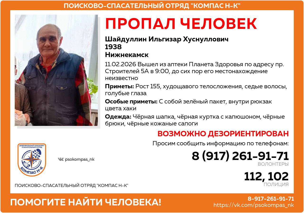 В Нижнекамске пропал 88-летний пенсионер. Сегодня утром он вышел из аптеки на пр. Строителей и с тех пор о его местонахождении ничего неизвестно