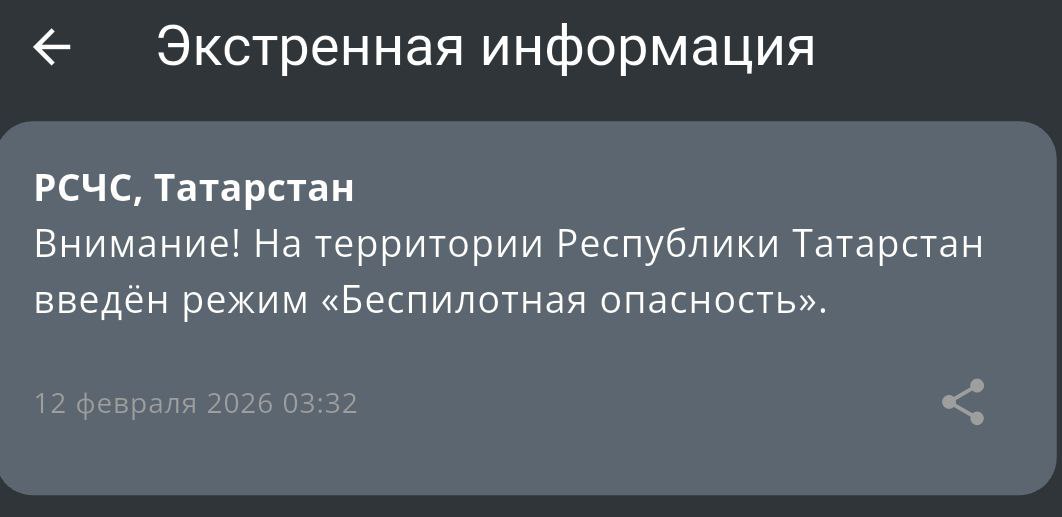 Он действует с 3:32.«Беспилотная опасность» - в случае выявления БПЛА, движущихся по направлению к республике.«Угроза атаки БПЛА» - если беспилотники обнаружены на территории Татарстана.@tatmediaofficial | Все...