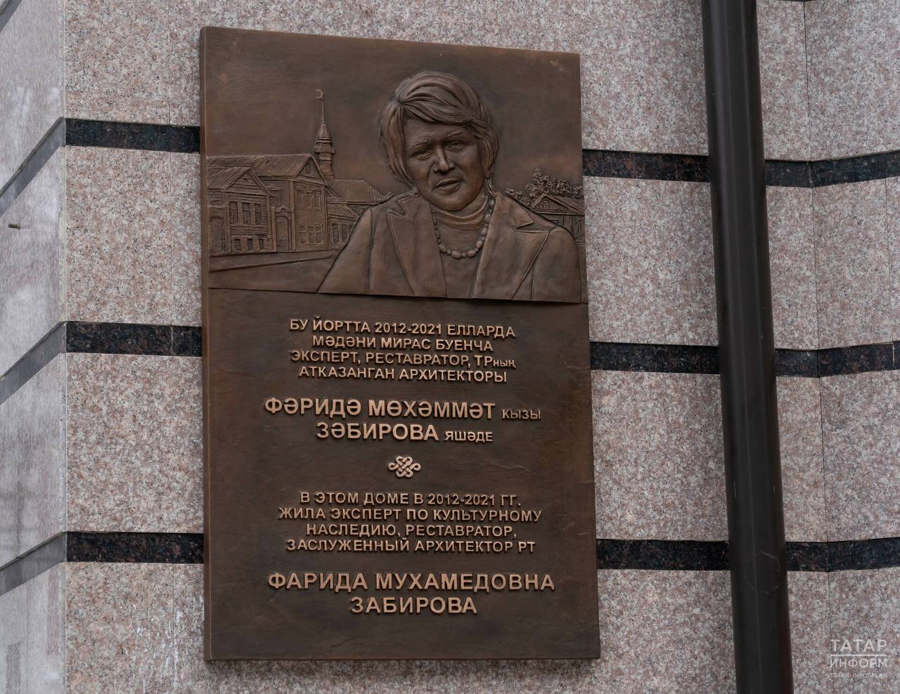 Мемориальную доску установили на доме, где жила Фарида Забирова, в день ее рождения – 11 февраля. Архитектору-реставратору исполнилось бы сейчас 72 года, она скончалась в 2021 году – летом будет 5 лет со дня ее смерти. Автор мемориальной доски – скульптор Владимир Демченко.