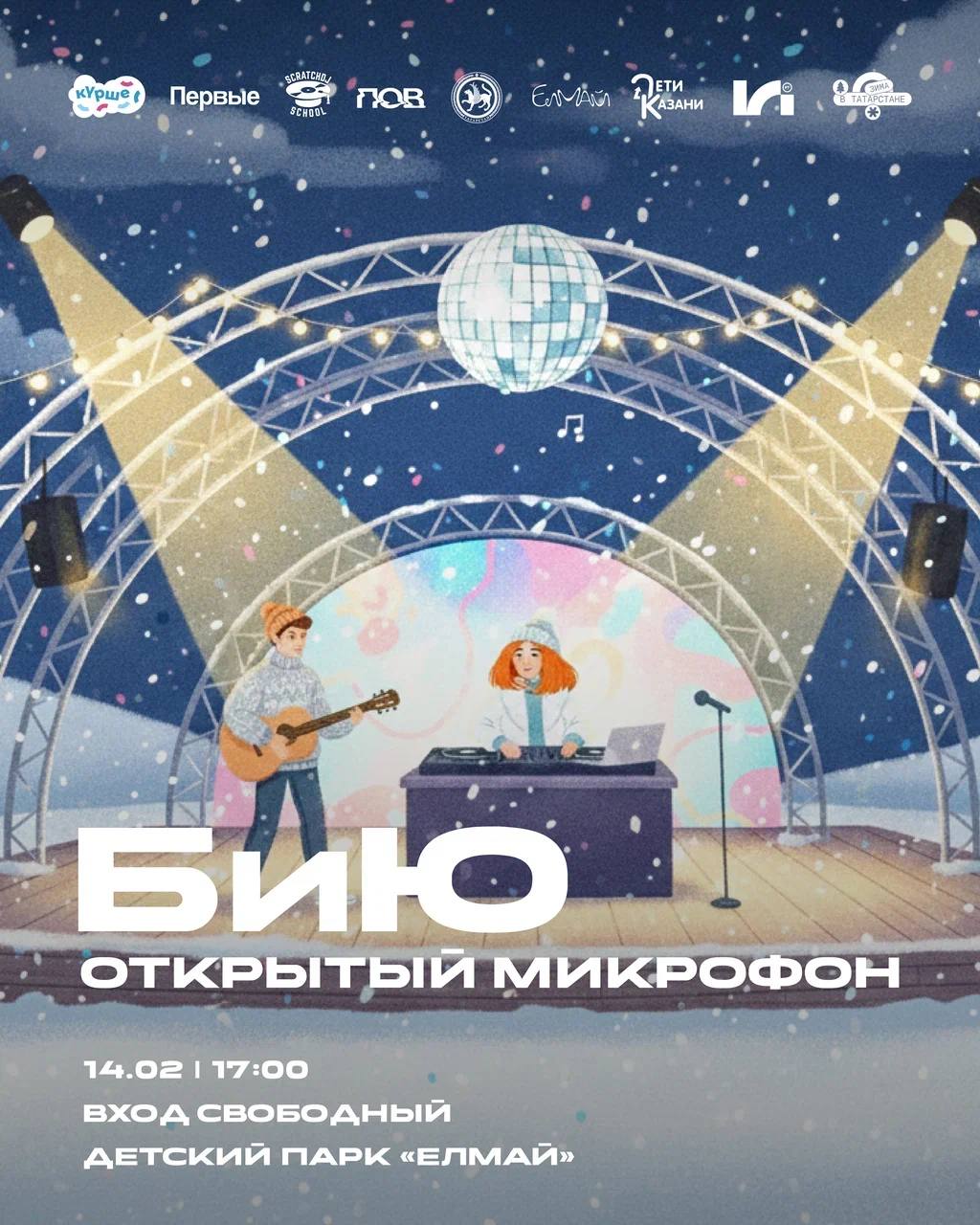 Что 14 февраля в 17:00 стоит показать свои таланты городу на открытом микрофоне для подростков в парке «Елмай». Гостей и участников ждут живые выступления, диджей-сет, горячие напитки и уютная атмосфера. Приходите