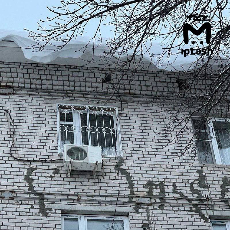 Глыбы снега свисают с крыши УФСИН — школа "СОлНЦе" стоит впритык, и родители переживают за макушки детей.