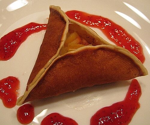 На незажаренную сторону поместить яблочную начинку, посыпать сахаром и корицей. Затем, поднимая края блинчика, сформировать треугольник и тщательно запечатать его. Слегка смазать растопленным сливочным маслом.