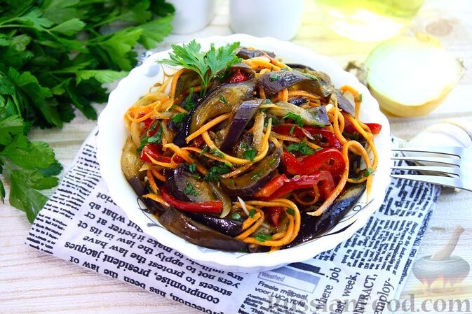 - Баклажаны по-корейски с перцем и морковью. Эта яркая закуска сочетает обжаренные баклажаны с хрустящей морковью и сладким перцем. Чеснок добавит остроты, а заправка из соевого соуса и уксуса подчеркнет насыщенность овощей.