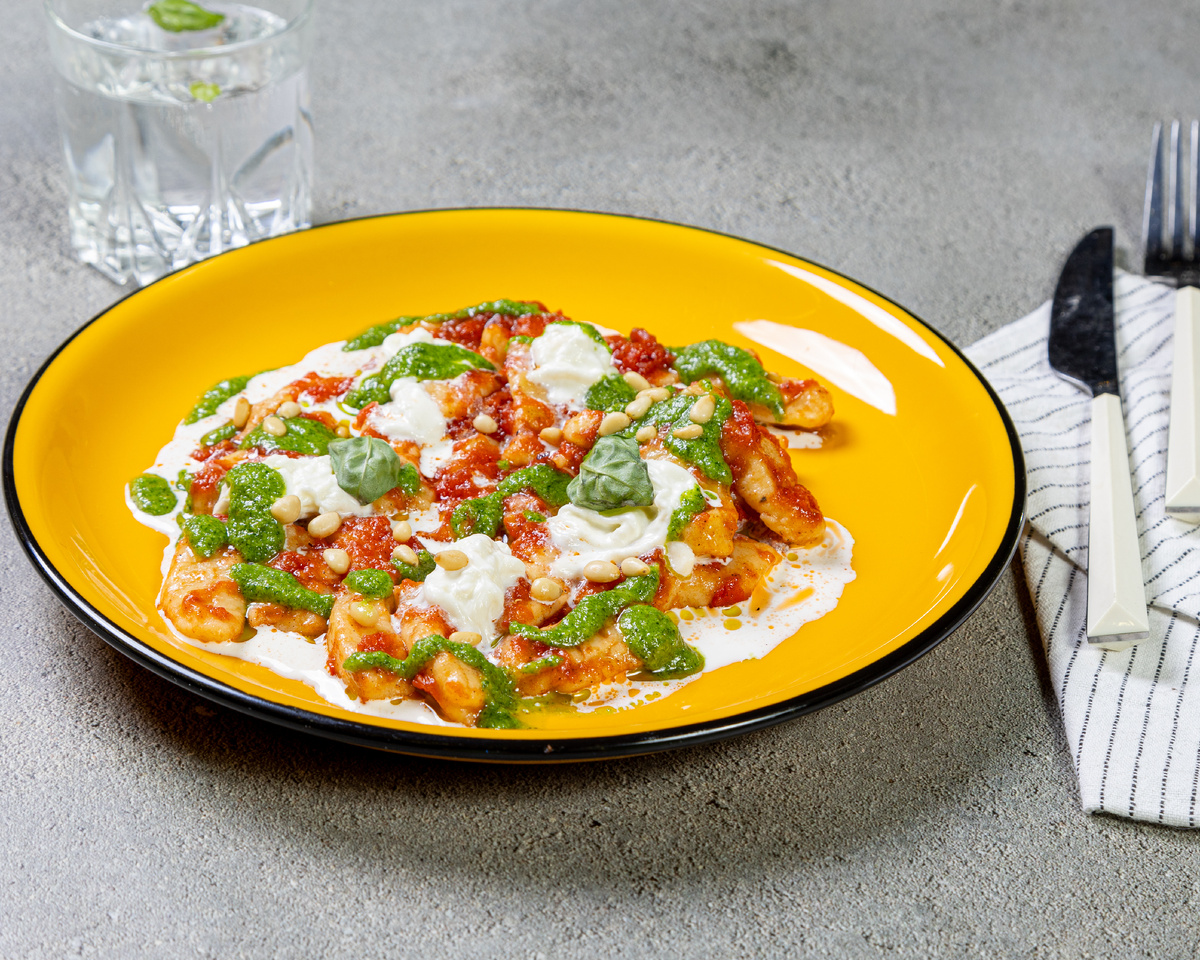 Ньокки из крахмалистого картофеля получают свою характерную лёгкость за счёт мягкой структуры теста, а песто из базилика и кедровых орехов добавляет яркий аромат. Страчателла при этом поддерживает кремовую текстуру и создаёт приятное ощущение тянущегося слоя на тарелке.