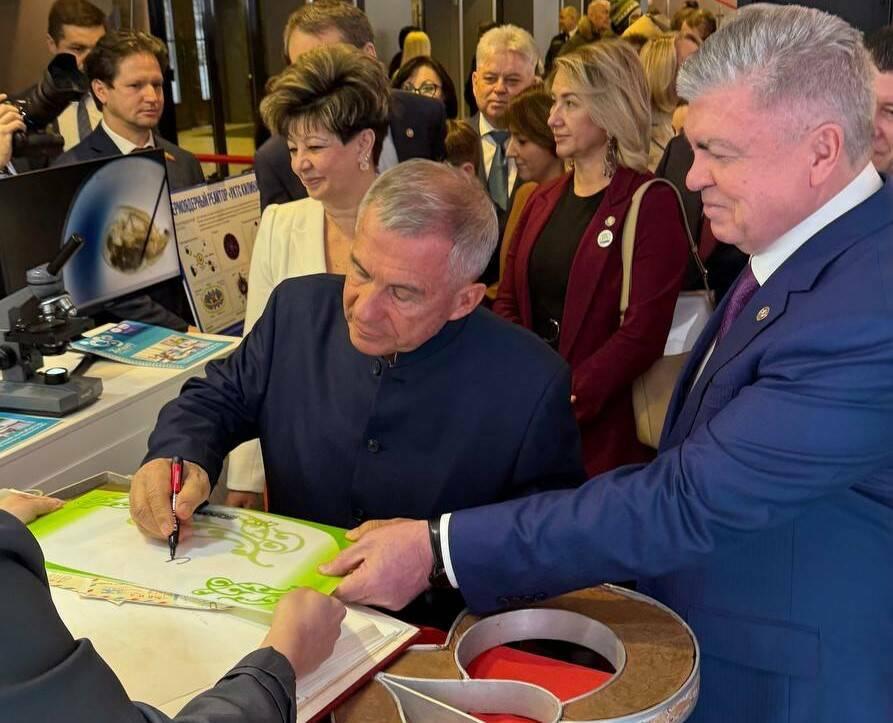 Рустам Минниханов с интересом выслушал рассказ об истории города и осмотрел переходящий факел, побывавший на ударных комсомольских стройках.