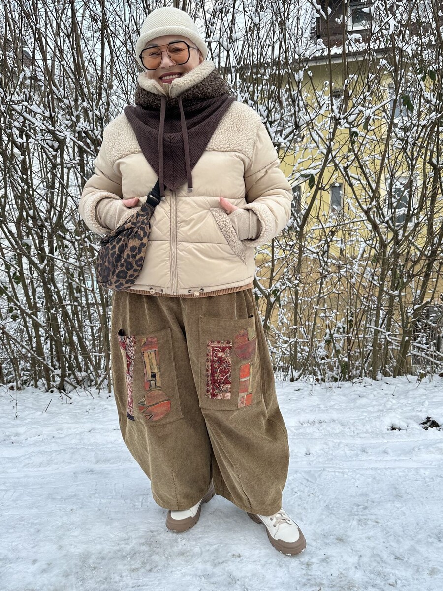 - Широкие брюки в стиле хаки: Брюки оттенка хаки с крупными карманами и яркой этнической вышивкой идеально подойдут для зимних прогулок. В сочетании с утепленной бежевой курткой и бело-коричневыми ботинками они создадут комфортный и стильный наряд.