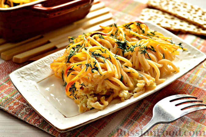 Отварив макароны, просто запекайте их в яичной заливке. Это позабавит вас своим простым сочетанием и надолго насытит.