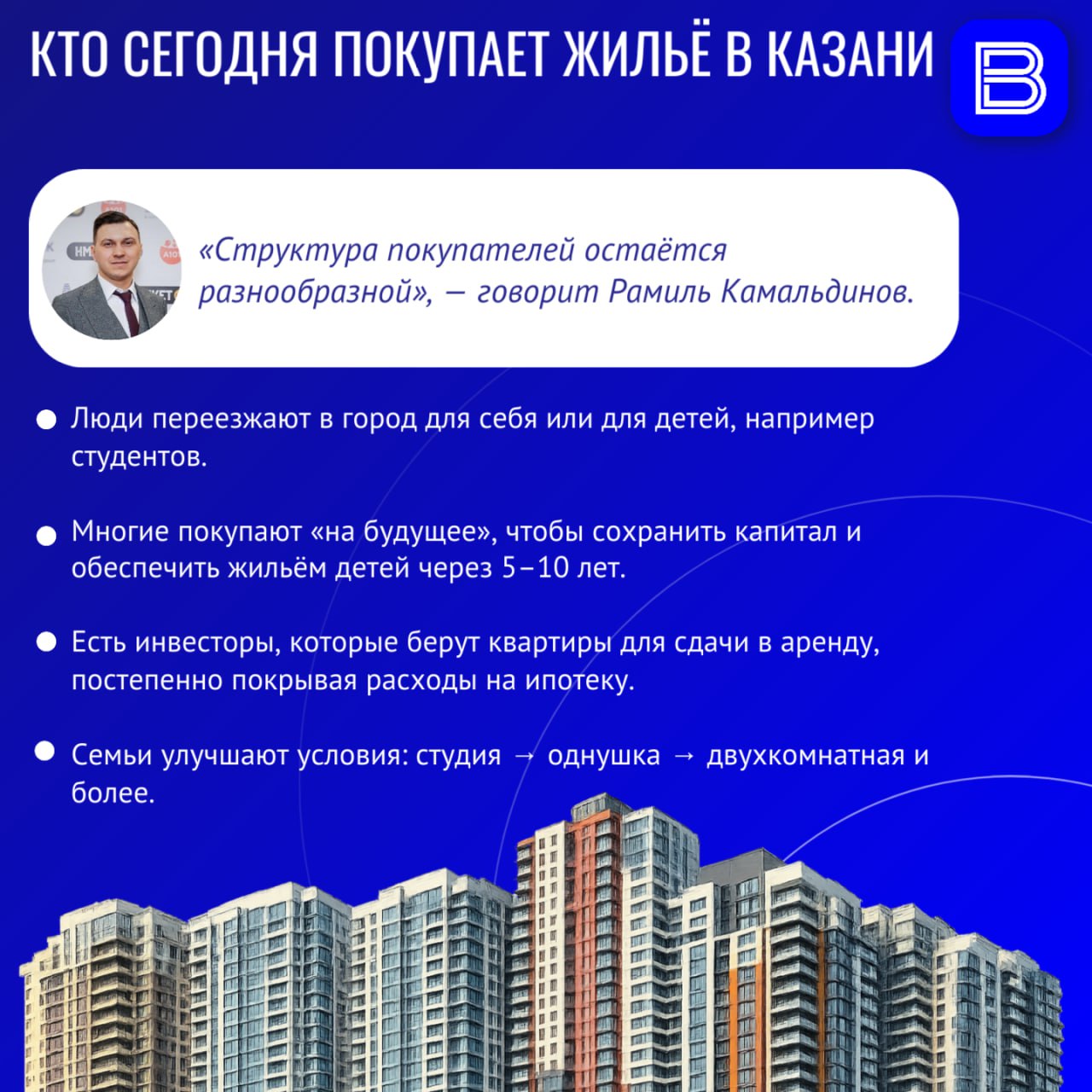 Несмотря на высокие ипотечные ставки, рынок жилья в Казани остаётся активным. Квартиры покупают семьи, инвесторы и те, кто берёт жилье «на будущее» для детей.