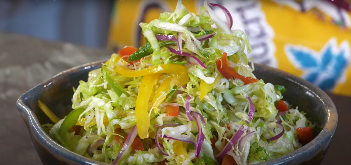 Для начала, луком и капустой надо заняться: шинкуйте их тонкими полосками — чем тоньше, тем лучше. Затем добавьте нарезанный болгарский перец в общую массу. Смешивайте перцы разных цветов, чтобы салат выглядел более эффективно.