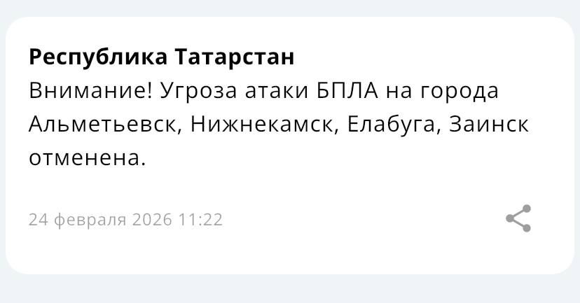 Угроза атаки БПЛА на города Альметьевск, Нижнекамск, Елабуга и Заинск отменена.