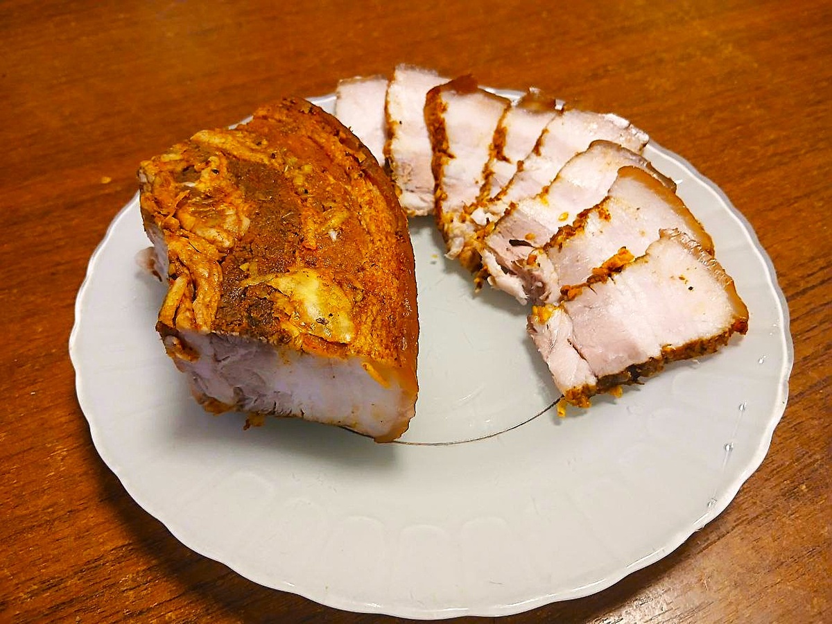 Домашняя свиная грудинка — символ уюта и семейных традиций. С каждым кусочком, выделяющимся сочностью и ароматом специй, она возвращает к воспоминаниям о теплых застольях с родными. Грудинка, обрамлённая золотистой корочкой с легкими нотками лавра и перца, станет настоящим украшением любого ужина или пикника. Тонкие ломтики этого деликатеса идеально дополнят чёрный хлеб, свежие огурцы и домашний горчичный соус.