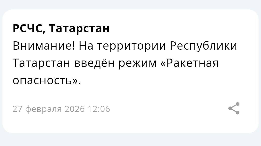 Режим угрозы ракетной атаки вводится в республике впервые за время войны, ранее регион много раз был атакован дронами, в последние дни в Татарстане почти ежедневно вводились режимы «Беспилотная опасность» и «Угроза атаки БПЛА».Подписаться на RV: MAX |...