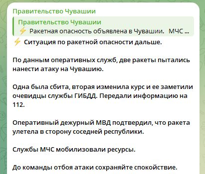 Две ракеты пытались атаковать соседнюю с Татарстаном Чувашию. Одну сбили, а вторая изменила курс и улетела за пределы региона, сообщает правительство Чувашии в телеграм-канале. В минобороны о сбитии не сообщали.