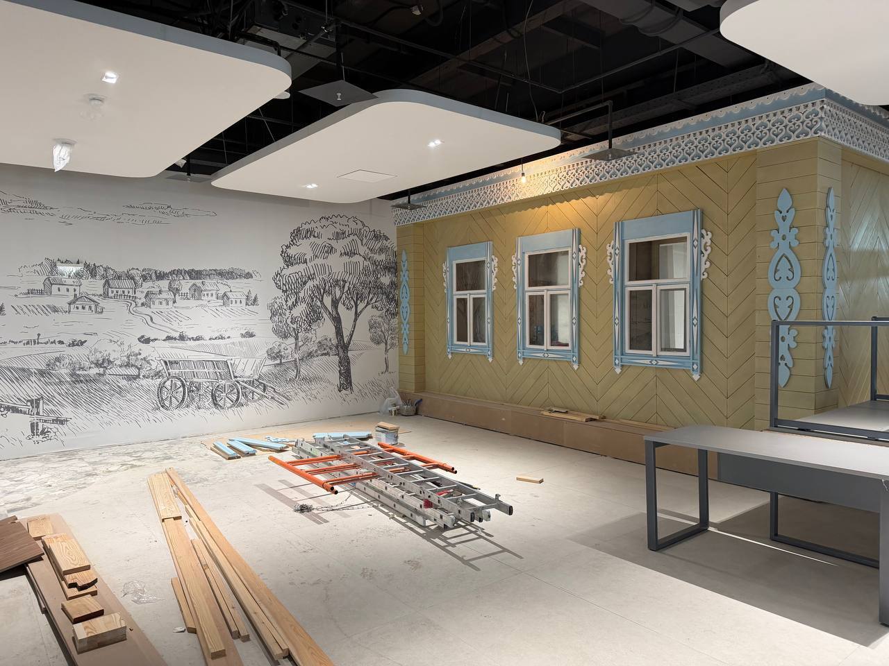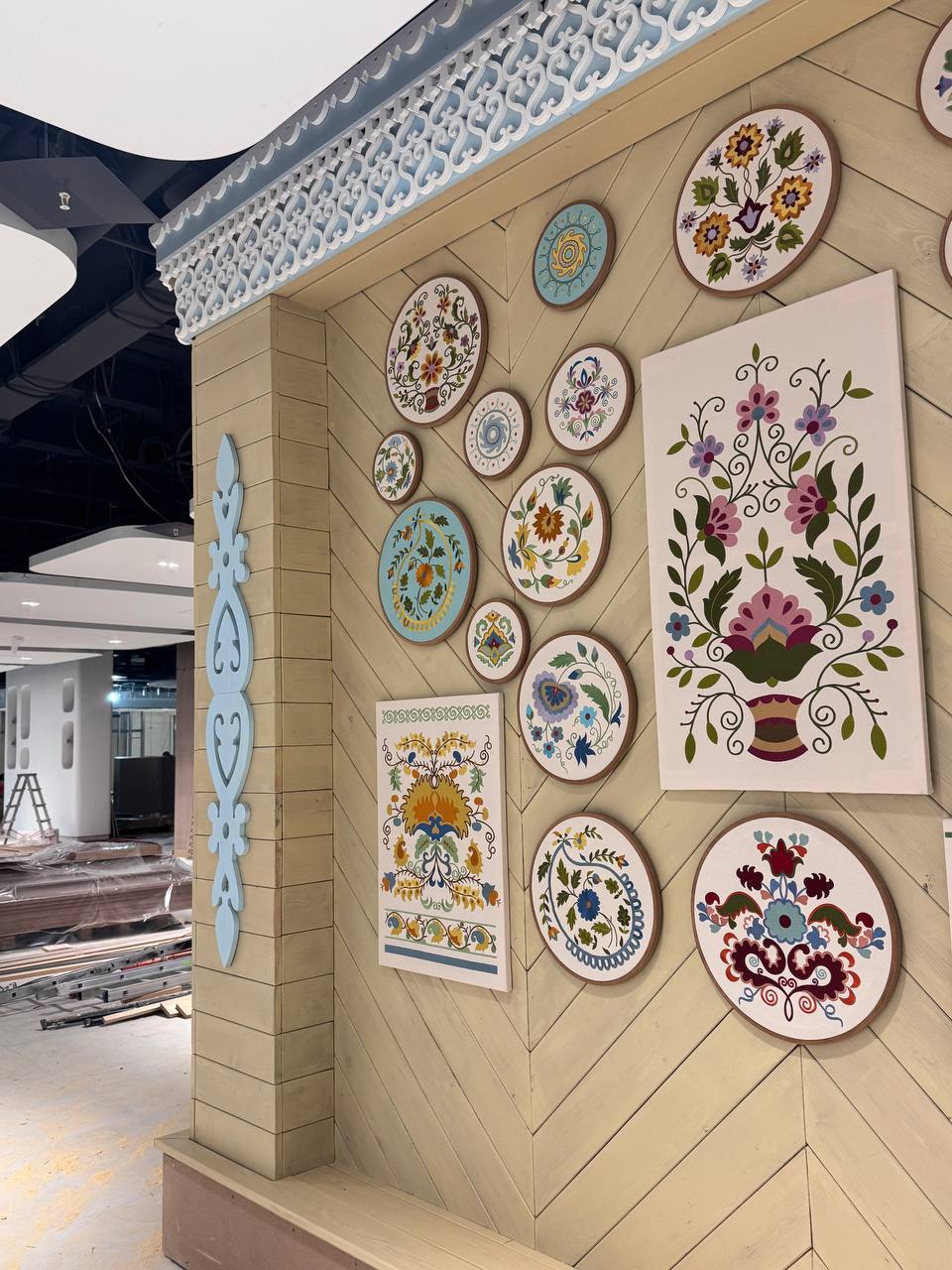 На фото виден внутренний интерьер, стилизованный под русский дом с деревянной отделкой. На стенах закреплены панели с яркими цветовыми растительными орнаментами.