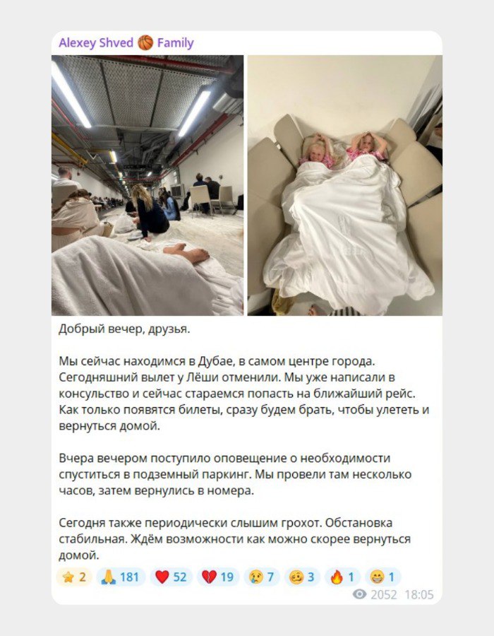 Многие татарстанцы сейчас не могут покинуть ОАЭ. Например, защитник УНИКСа Алексей Швед застрял в Дубае вместе с семьей. Они не выходят из отеля, а один раз даже были на подземной парковке, когда прозвучала сирена. Владелец челнинской сети «Наиком» Наиль Хуббатуллин тоже был там, но успел «свалить» в Эль-Ливу эмирата Абу-Даби. Кроме того, гендиректор АНО «Бала-Сити» Альбина Насырова рассказала, что школа, которую она открыла в Дубае, перешла на «дистант».