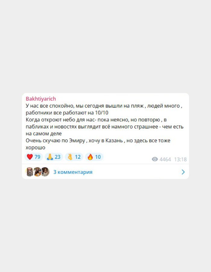 «Должны были улететь вчера, но теперь непонятно, улетим ли мы... Выкладывать все фото и видео запрещено, просто поверьте, что это очень жутко. На весь город поет молитва и хлопки», — написала сегодня в своем телеграм-канале блогер Ильнара Бахтиярова.