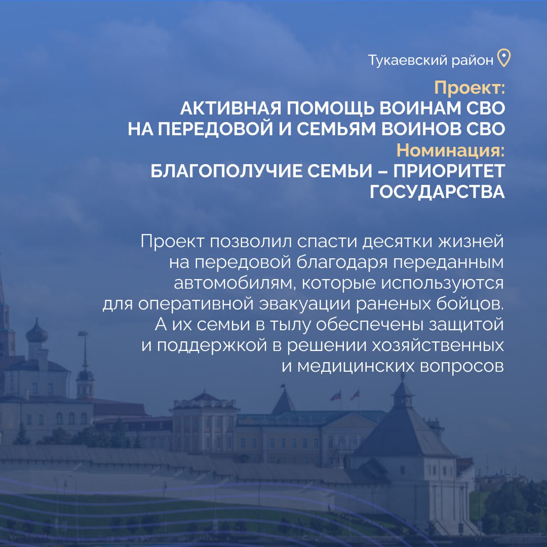 • проект муниципального депутата Тукаевского района Валерия Тигра «Активная помощь воинам СВО на передовой и семьям воинов СВО».