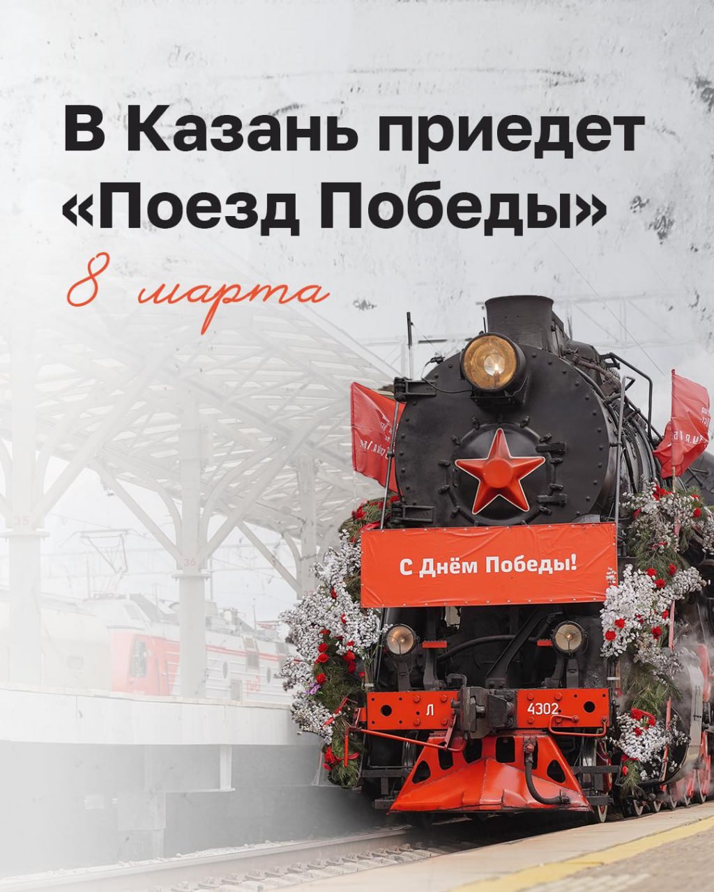 С 8 по 10 марта в Казани будет работать экспозиция «Поезд Победы», где представлены инсталляции, связанные с образами Великой Отечественной войны