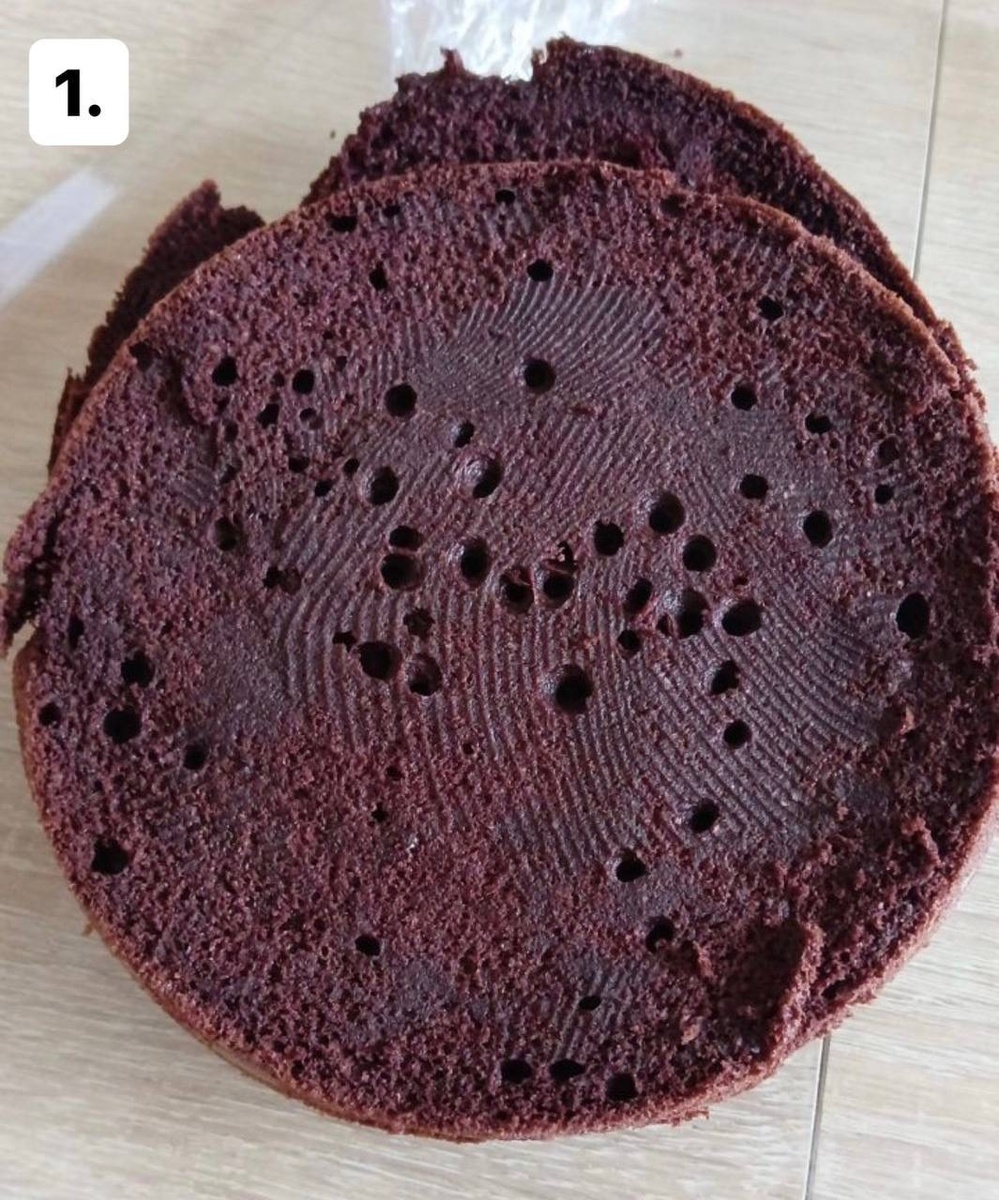 Если в бисквите появляются дырочки, это также указывает на проблемы с меренгой. При взбивании на высоких оборотах образуются крупные пузырьки, которые при выпечке лопаются, оставляя неровности. Оптимально взбивать меренгу на средних оборотах — это обеспечивает равномерное распределение мелких пузырьков.