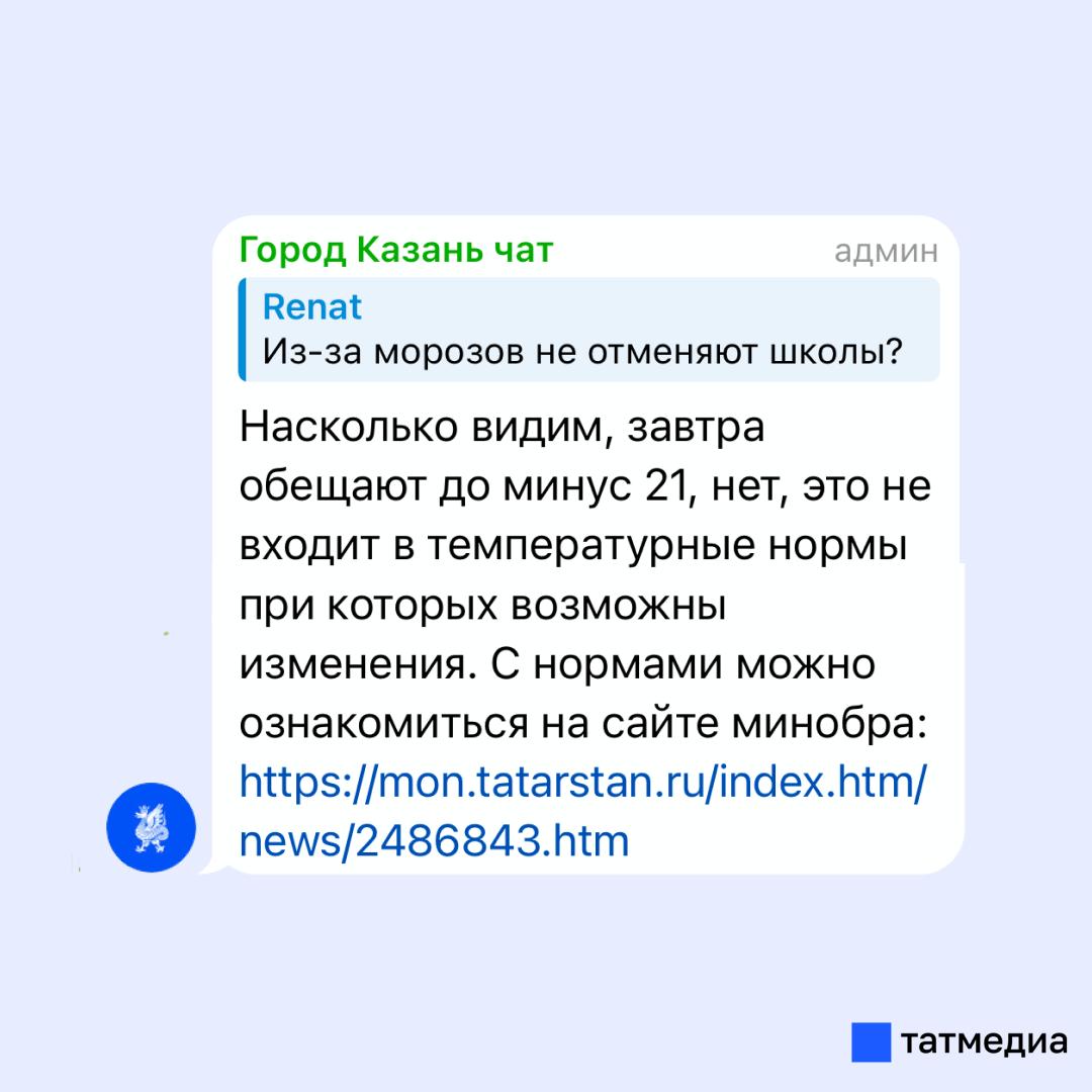 Мэрия Казани в своем чате сообщила, что завтра занятия не отменяются