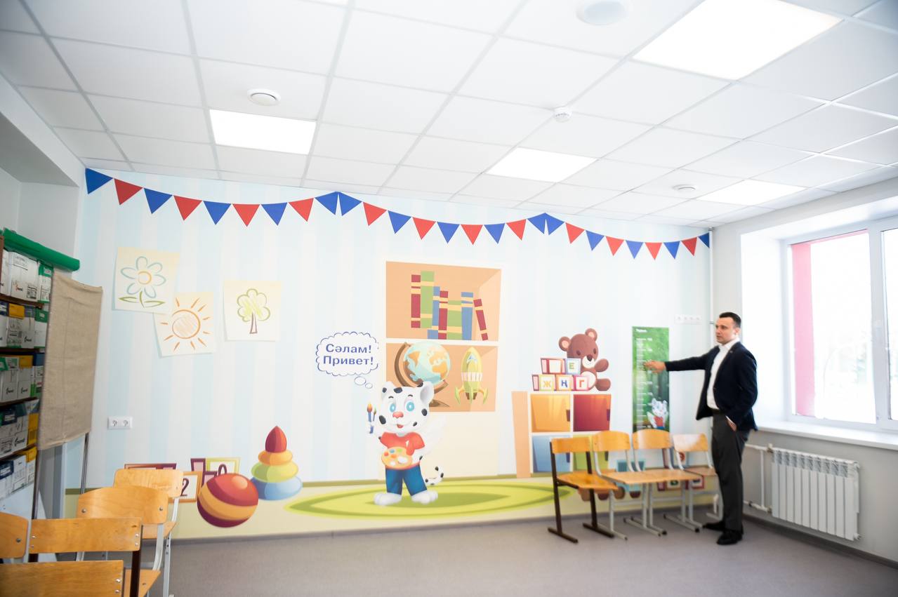 Интересная деталь на первом этаже — на столбах появились имена наших активистов. Каждый сможет прийти, найти своё имя, сфотографироваться. С другой стороны разместили мотивирующие надписи на русском и татарском языках. Вроде простая идея, но именно такие детали создают особый уют месту, и напоминают детям о том, что каждое из достижение имеет значение.
