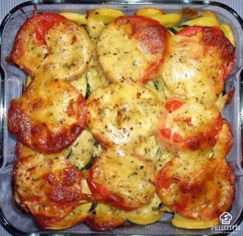 Теперь можно собирать блюдо. На противень укладываются нарезанные кружки кабачка. Сверху помещаются ломтики помидора, а на них — сырно-чесночная масса.