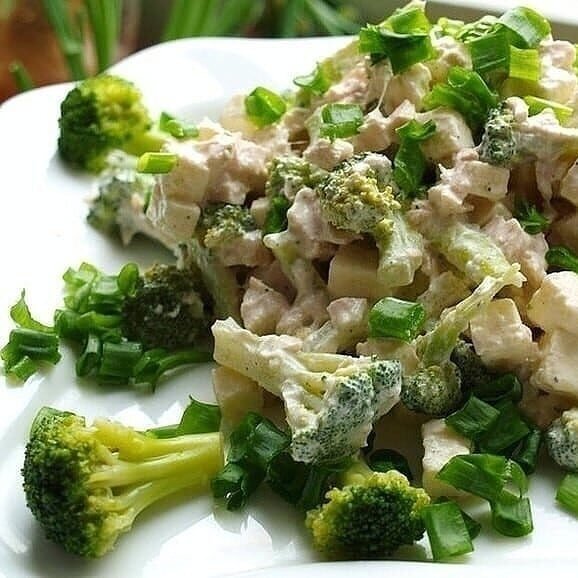 Чтобы начать, необходимо отварить брокколи в подсоленной воде на протяжении 4-5 минут. После этого, аккуратно выложить на тарелку и дать остыть. Разделите брокколи на соцветия, добавьте заранее нарезанную отварную курицу и брынзу. Хорошо перемешайте.