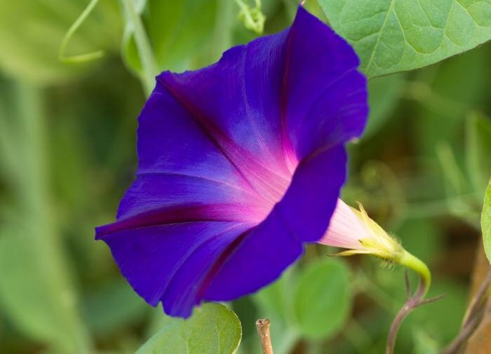 - Синяя ипомея (Ipomoea tricolor) — одна из самых известных красавиц. Ее синие цветы словно излучают магию, особенно на фоне зеленых листьев. Это летнее цветущее растение требует солнечного расположения и богатого грунта.