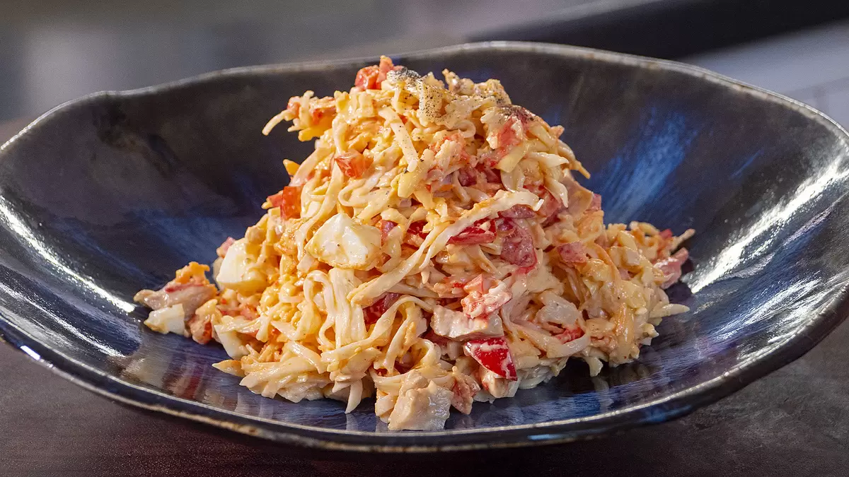 Все эти компоненты аккуратно разместить в глубокой миске. Далее добавляются крабовые палочки, нарезанные тонкими полосками или кубиками, в зависимости от предпочтений.