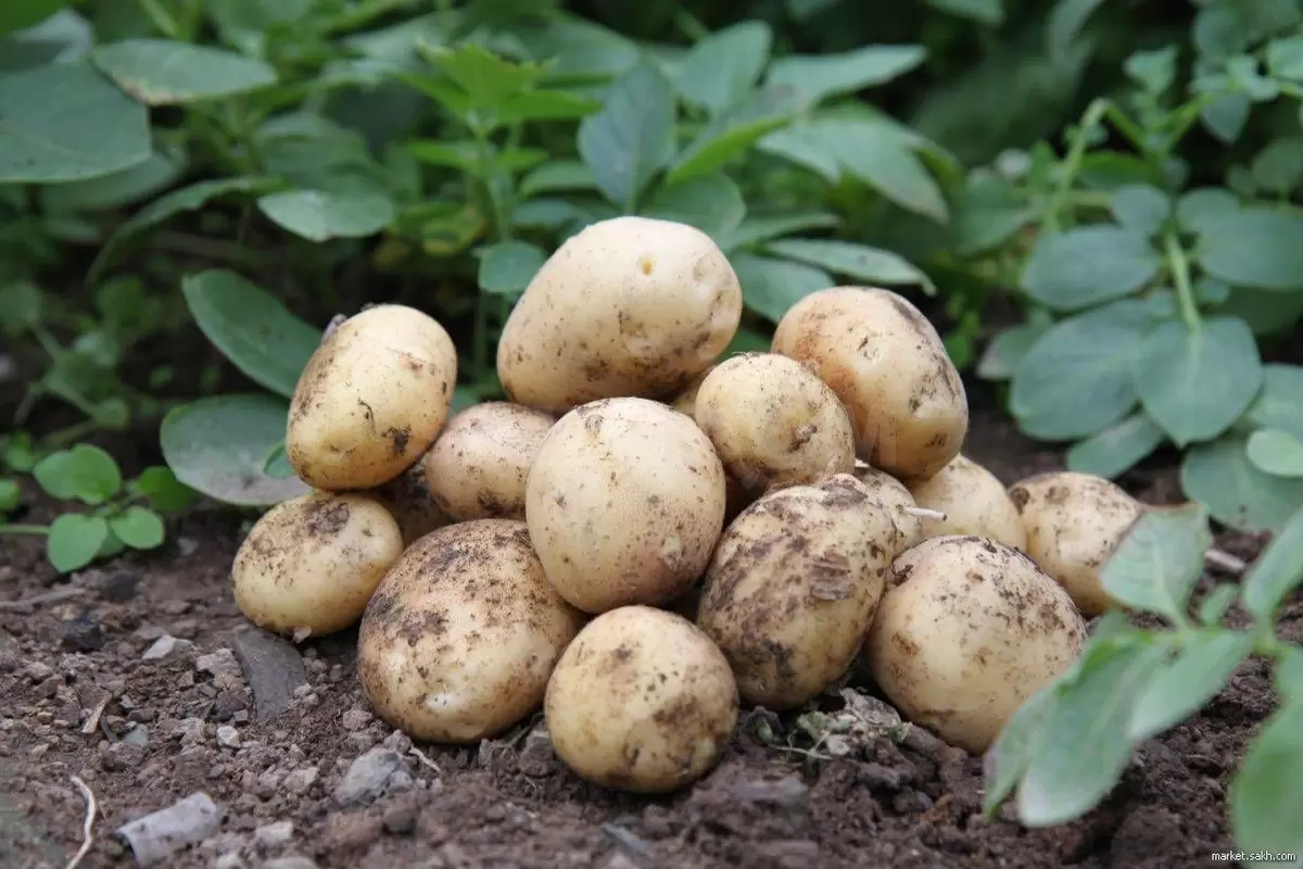 - Сказка — этот сорт не требует особых условий почвы и не переносит избыточного увлажнения. В одном гнезде может находиться до 25 клубней, которые при варке не темнеют и не разваливаются. Высокая устойчивость к фитофторозу и другим заболеваниям делает его фаворитом у многих огородников.