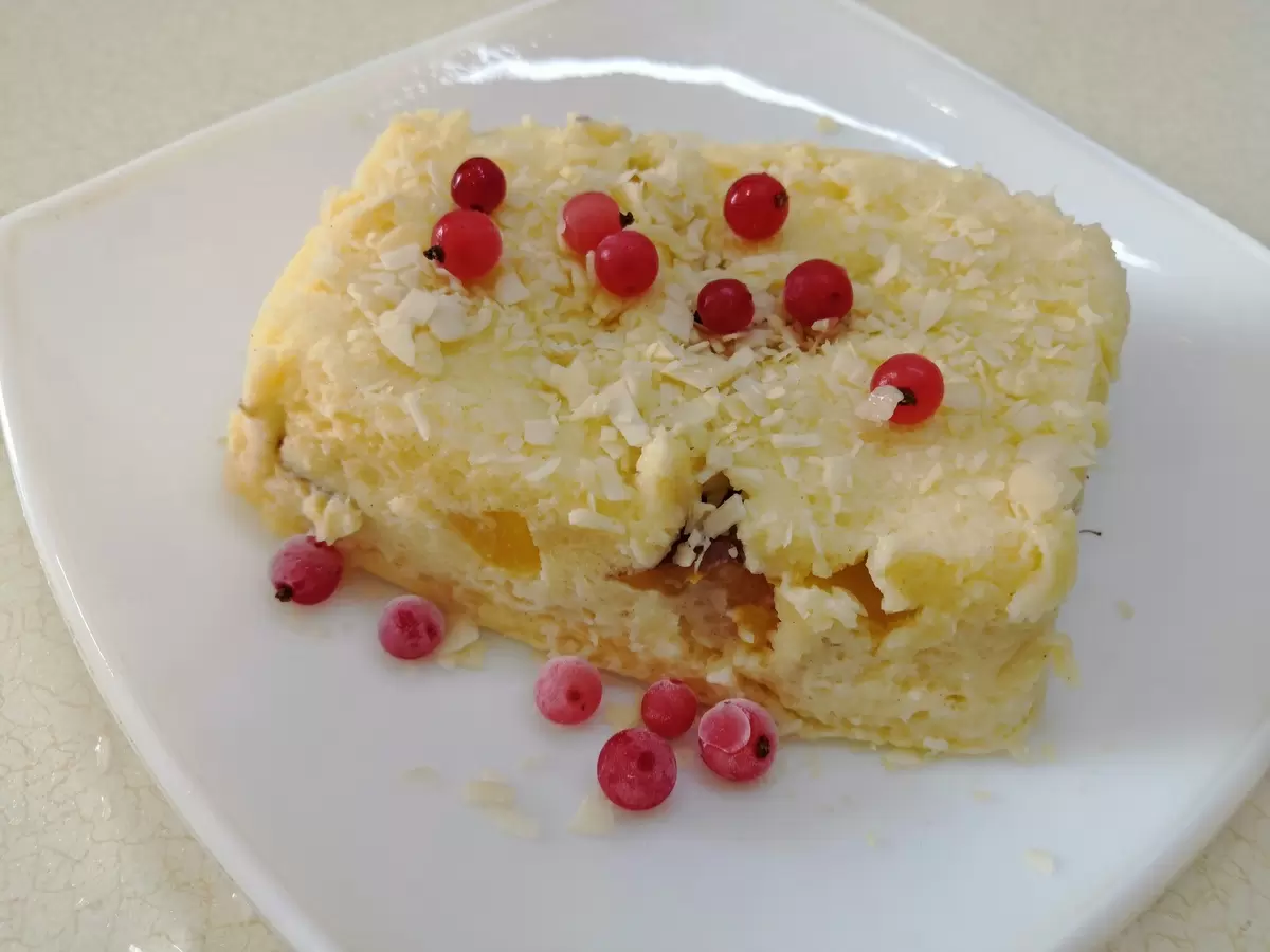 Затем в тесто добавляется нарезанный персик, и всё снова хорошо перемешивается. Массу выкладывают в форму для микроволновки и готовят на мощности 700 Вт в течение 5 минут. Кекс получается невероятно влажным и ароматным. По желанию его можно украсить миндальными лепестками и ягодами красной смородины, придавая блюду элегантности и дополнительного вкуса.