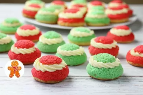 Сначала взбивается сливочное масло с сахарной пудрой. После этого постепенно добавляется мука, перемешивая до однородности. Полученную массу делят на две части: одну окрашивают в красный, другую – в зеленый цвет. Для создания красивого отпечатка на украшении теста, его оборачивают в пленку и помещают в холодильник на 30-40 минут для охлаждения.