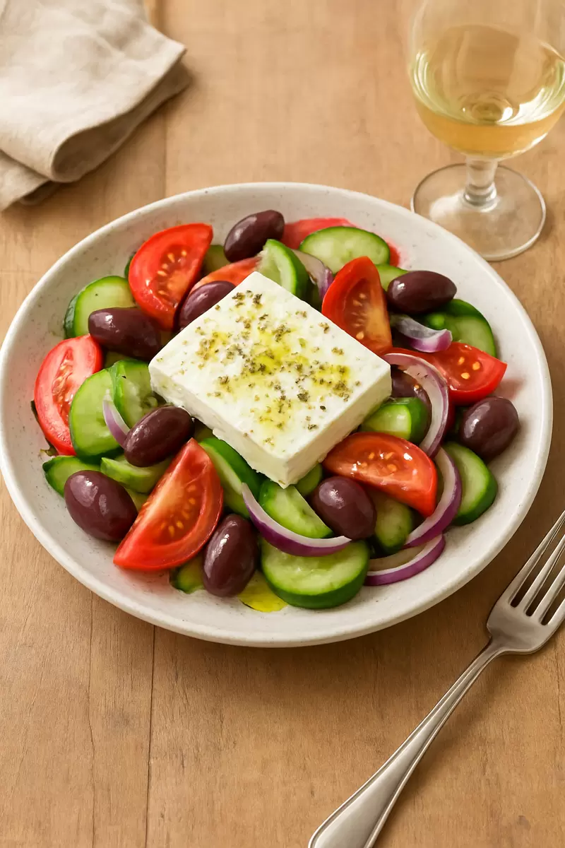 Секрет в том, что греки не крошат фету, а оставляют ее целым бруском, что делает подачу стильной и аутентичной. Эта простота и искренность в каждом ингредиенте делают блюдо не только вкусным, но и душевным.