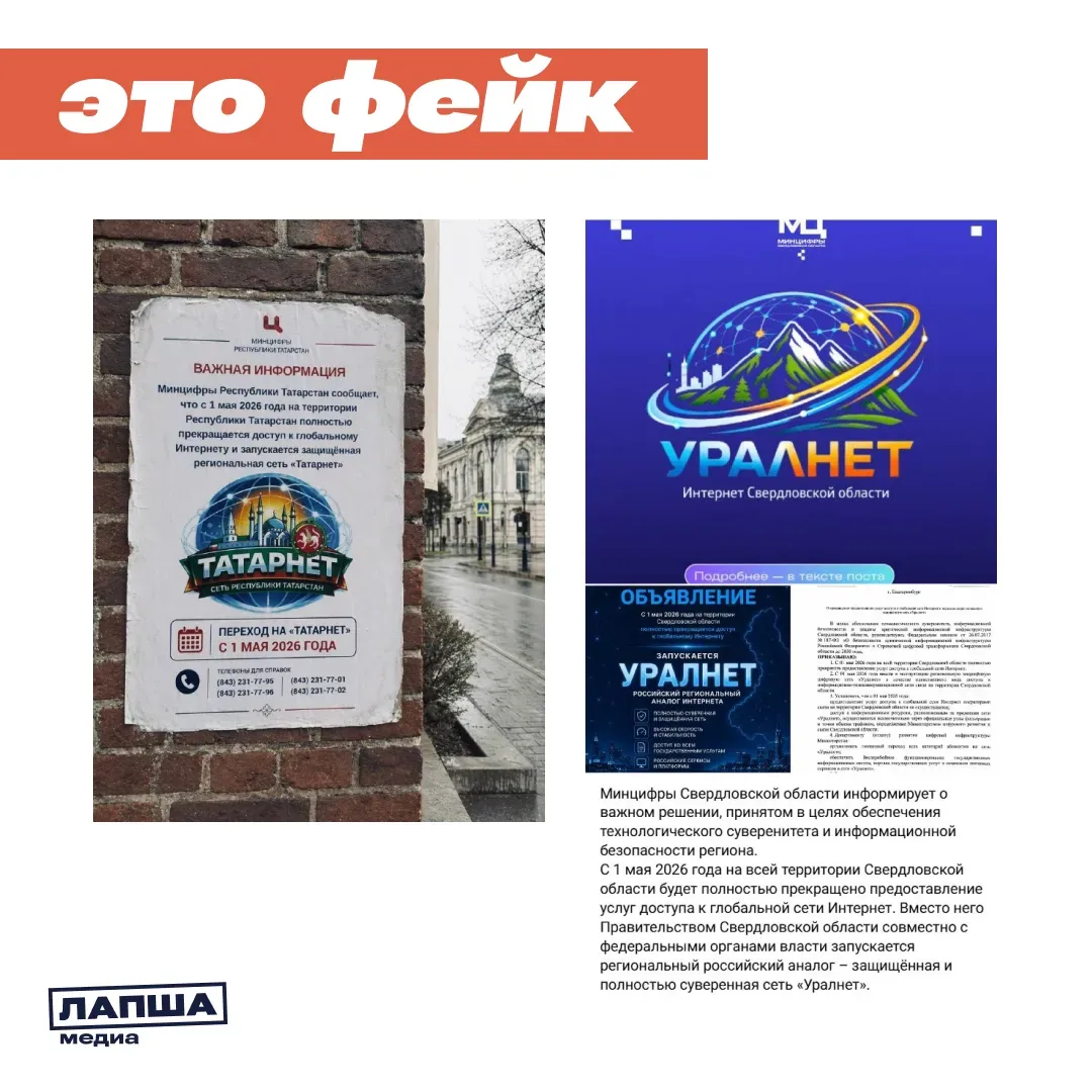 С 1 мая Свердловскую область и Татарстан якобы отключат от глобального интернета и переведут на региональную сеть — «Уралнет» и «Татарнет». Об этом пишут со ссылкой на листовки и документы региональных министерств цифрового развития.