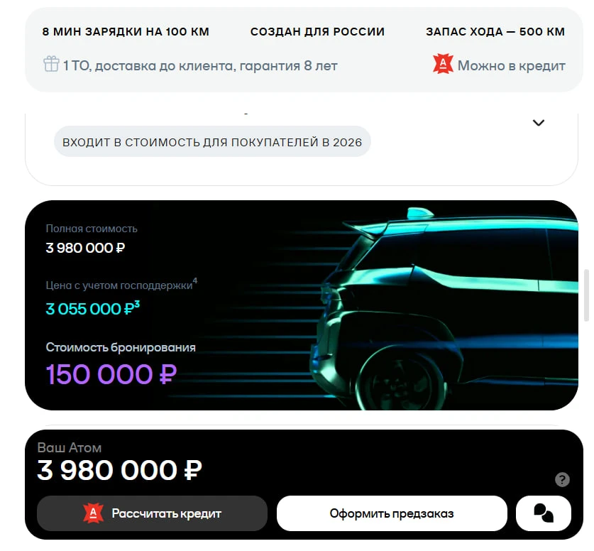 Как указано на сайте, полная стоимость электромобилей сейчас 3,98 млн, при господдержке авто будет стоить чуть больше 3 млн. Льготная цена доступна при оформлении автокредита. При этом с учетом процентов по нему (например, при сроке 96 месяцев) итоговая стоимость может достигать 4,4 млн.