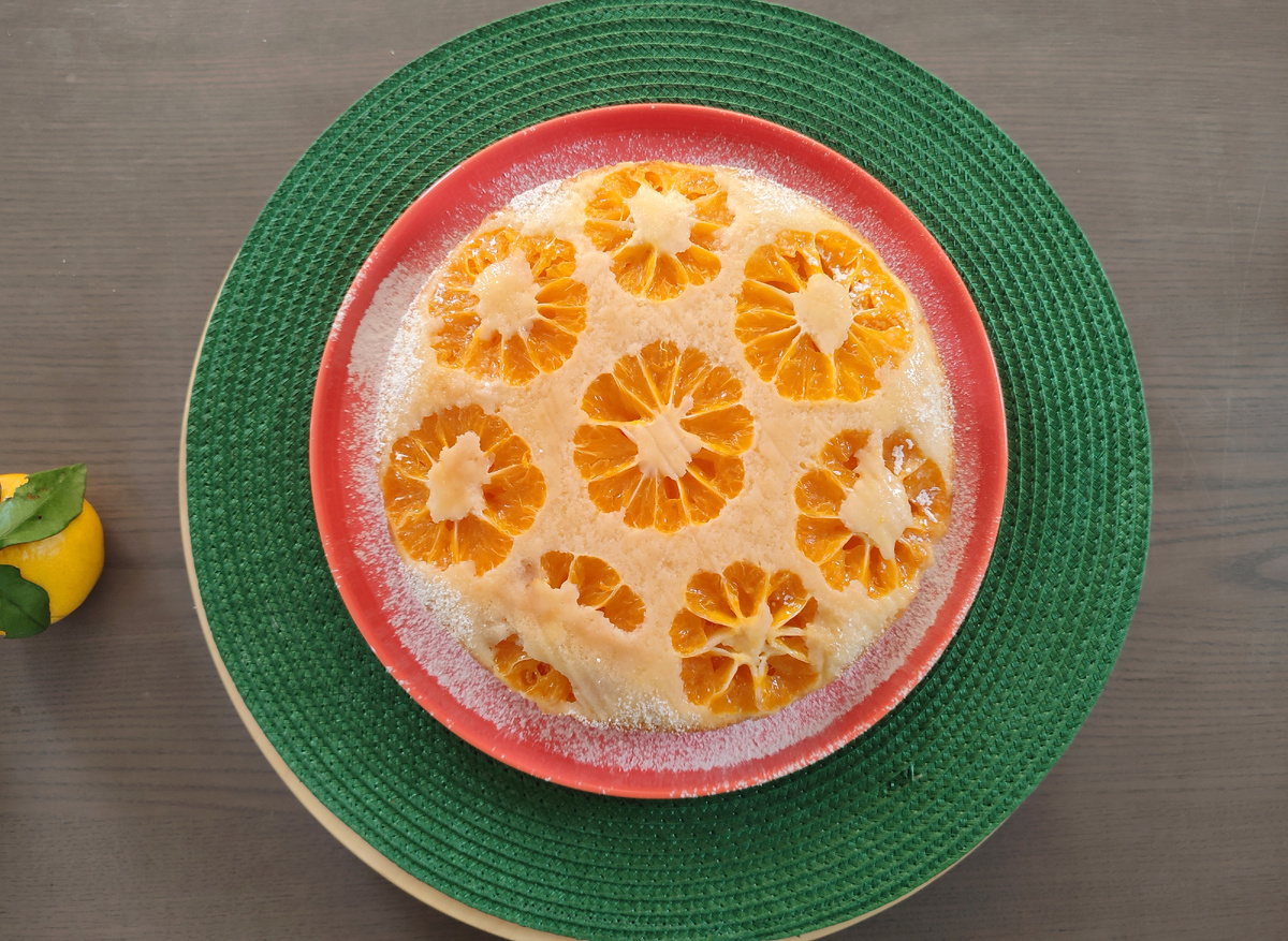 После выпекания аккуратно переверните пирог на блюдо, чтобы мандарины оказались сверху — это добавит эстетики и аромата готовому десерту.