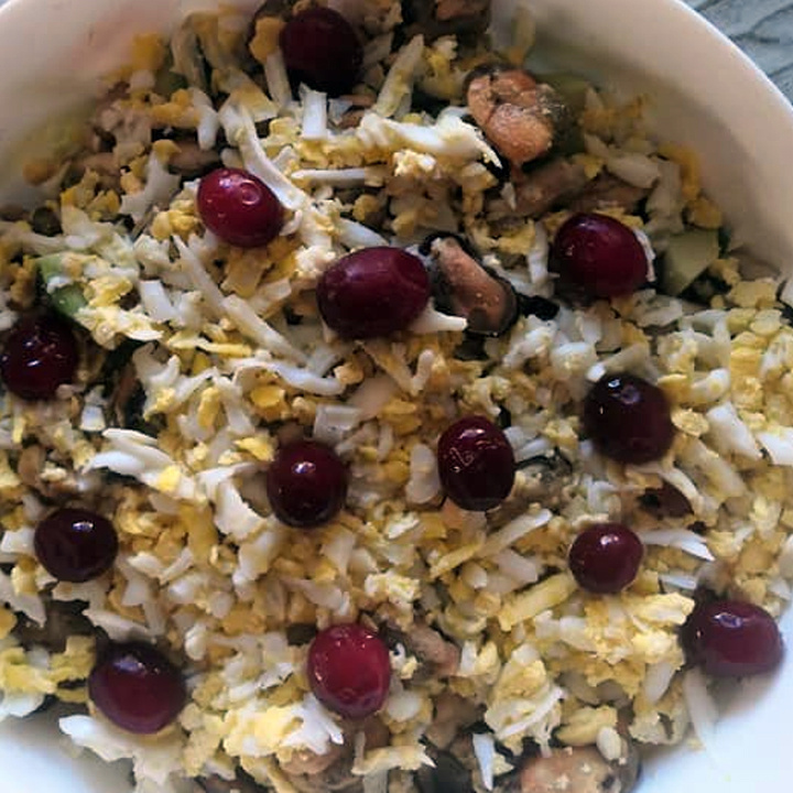 Мидии достаточно оставить на 10 минут в горячей воде, чтобы они разобрались в своей текстуре и стали мягкими. Вареные яйца натираются на тёрке, а для дополнительной пикантности можно добавить несколько ягод клюквы.