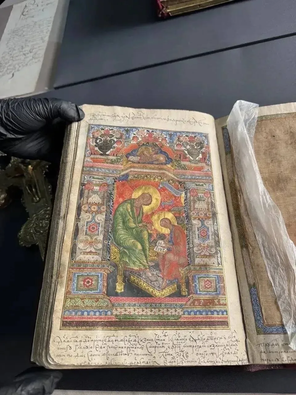 Также он обратил внимание на Адрианово Евангелие конца XVII века весом 11 килограммов, украшенное золотом, драгоценными камнями и эмалевыми вставками.