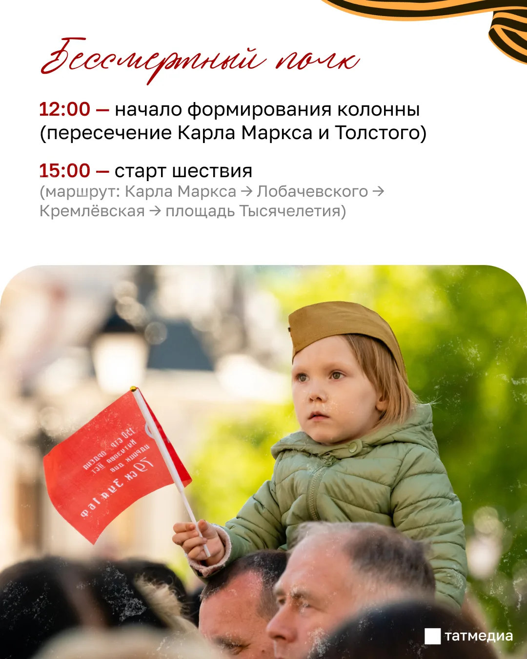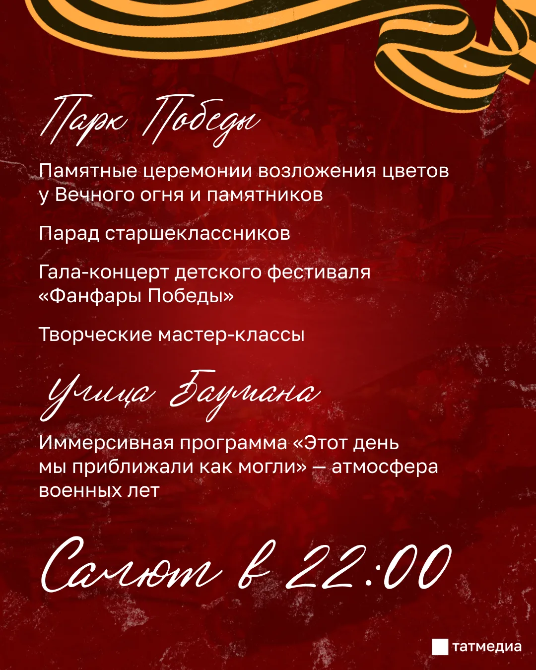 Основные события пройдут на площади Тысячелетия, в Парке Победы и в Казанском Кремле.Праздничные мероприятия начнутся утром с церемонии возложения цветов на кладбищах, у Вечного огня и памятников воинам. Днем пройдет шествие, также ожидаются парад...