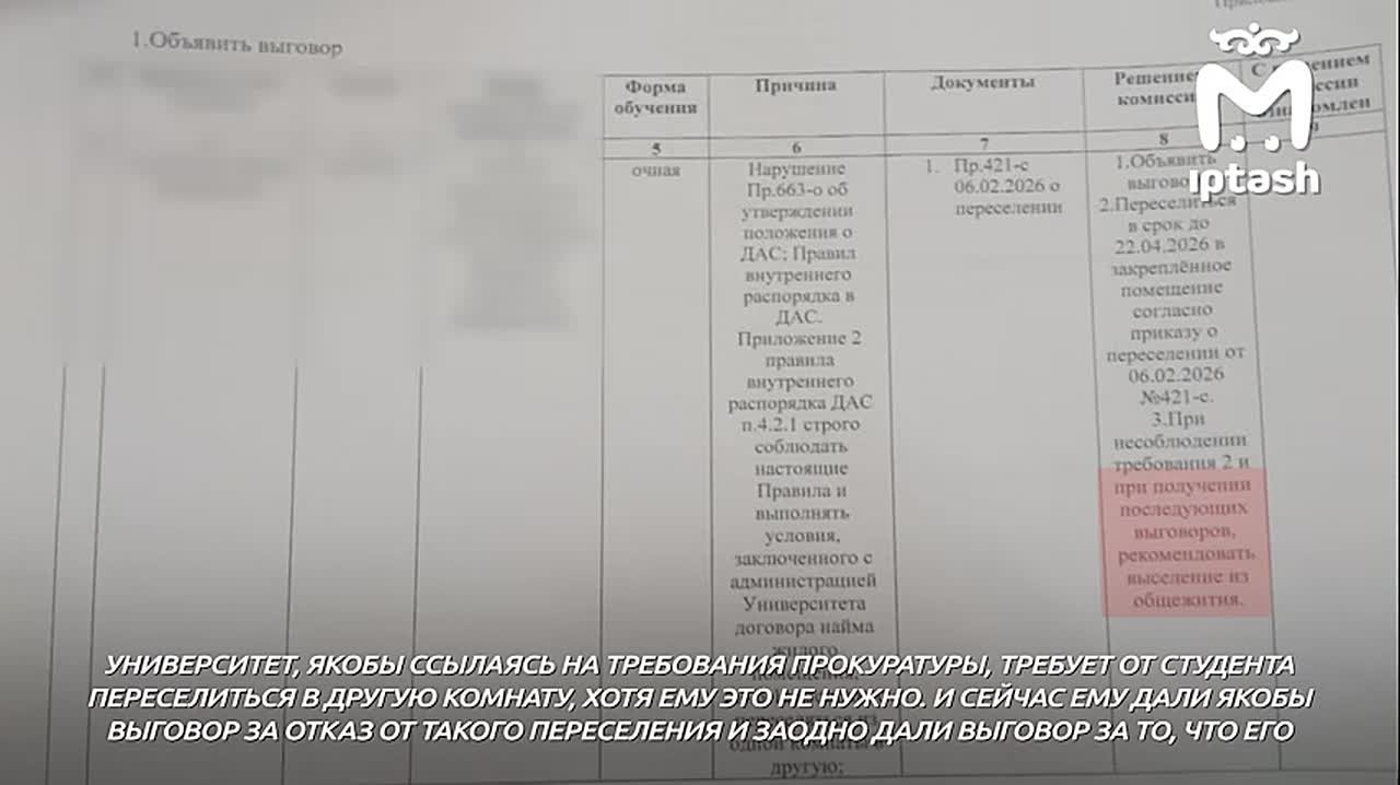 Парень говорит: после публикации Mash Iptash про антисанитарию его вызвали в деканат и поздравили с двумя выговорами. А это уже равно отчислению. Первый — за то, что не экономил электричество, хотя платит за него сам. Второй — за отказ переселяться в другую комнату.
