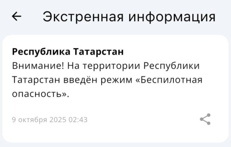 Он действует с 2:43.«Угроза атаки БПЛА» - если беспилотники обнаружены на территории Татарстана.«Беспилотная опасность» - в случае выявления БПЛА, движущихся по направлению к республике.@tatmediaofficial | Все...