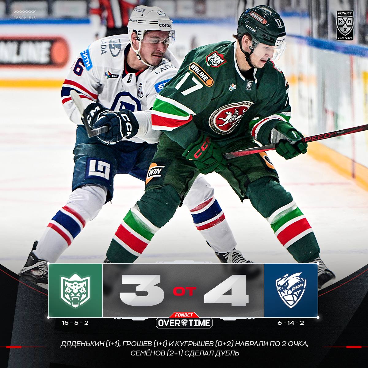 Казанский «Ак Барс» проиграл тольяттинской «Ладе» со счетом 3:4 в овертайме в домашнем матче регулярного чемпионата «Фонбет» — КХЛ.