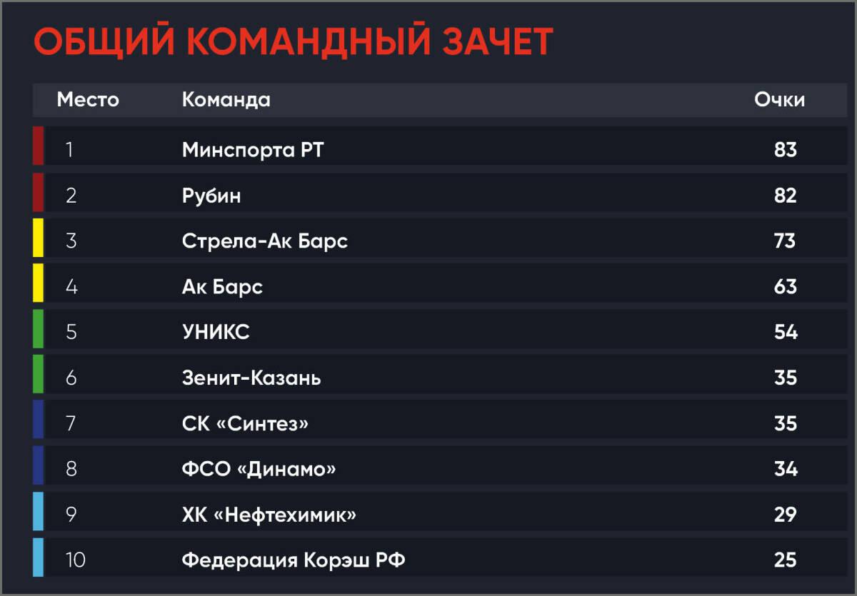 Общекомандный зачет возгавляют Минспорта РТ, ФК «Рубин» и РК «Стрела-Ак Барс».