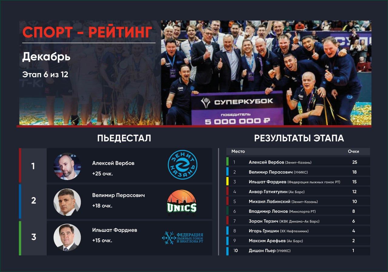 По итогам декабря тройку сильнейших в личном зачете составили главный тренер ВК «Зенит-Казань» Алексей Вербов, главный тренер БК УНИКС Велимир Перасович и президент Федерации лыжных гонок РТ Ильшат Фардиев.