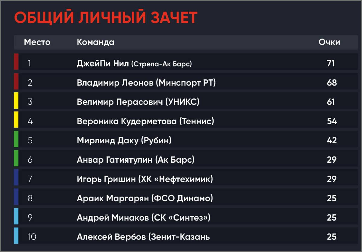 В общем личном зачете по сумме 6 этапов этапов на первом месте остался наставник «Стрелы-Ак Барс» ДжейПи Нил, на втором месте министр спорт Татарстана Владимир Леонов. Также в тройку лидеров ворвался Велимир Перасович.